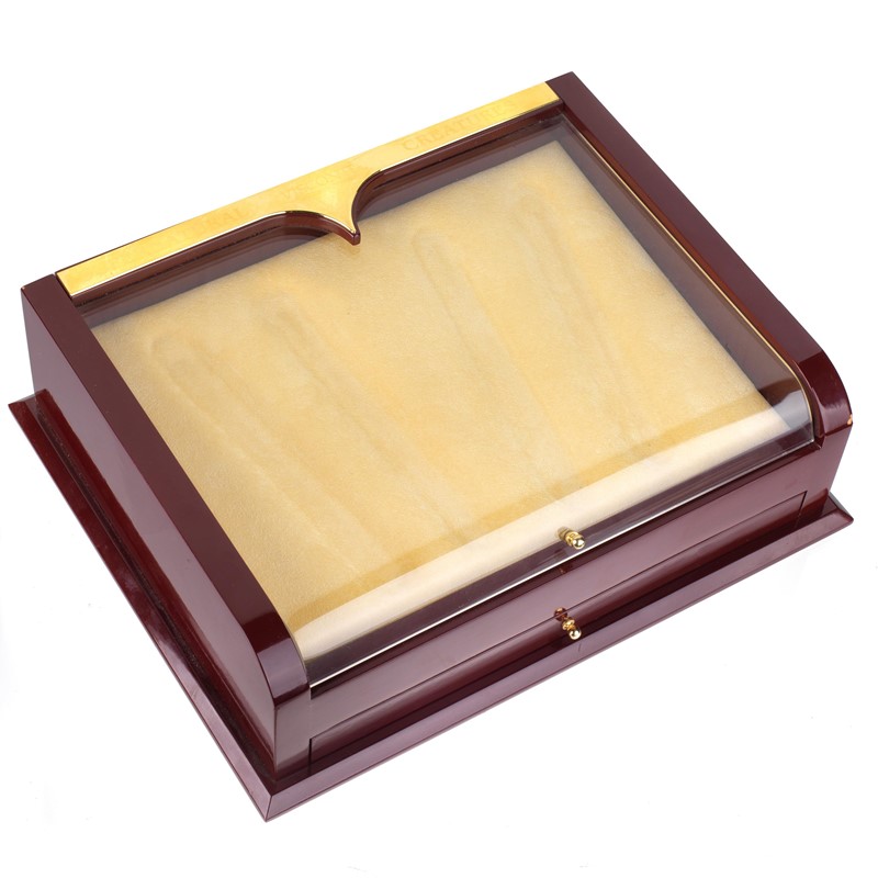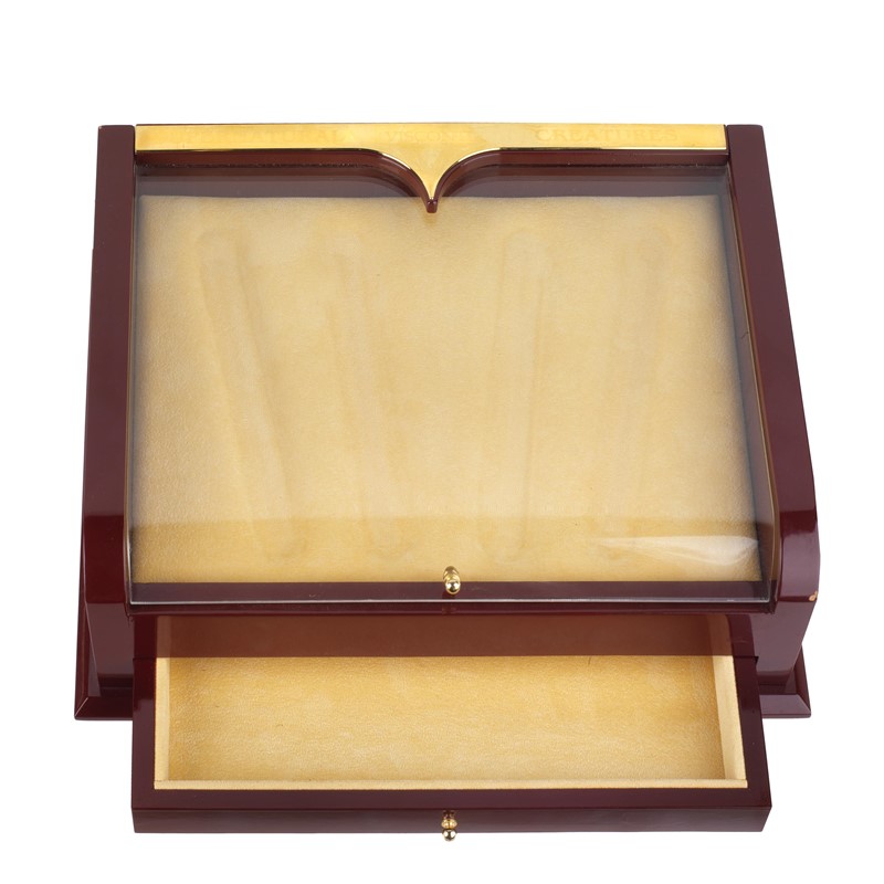 VISCONTI ESPOSITORE PORTA PENNE STILOGRAFICHE SERIE "CREATURE SOPRANNATURALI" in legno laccato di colore bordeaux, ad un piano foderato in tessuto beige, corredata di un cassetto foderato in tessuto beige, dotata di sportello in plexiglass. Dim. cm 30x24,x9,5