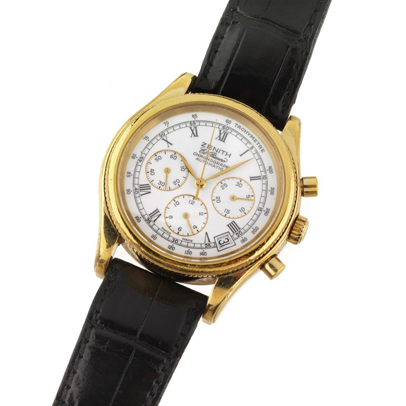 cassa placcata in oro, fondello a pressione in acciaio, lunetta zigrinata e liscia placcata in oro, tasti a pompa, corona marcata, quadrante bianco, datario tra le ore quattro e le ore cinque, contatore dei secondi a ore nove, contatore dei minuti a ore tre, contatore delle ore alle sei, movimento a carica automatica, cinturino non originale in pelle nera, fibbia in metallo dorato, vetro plastica. Diam. 38
