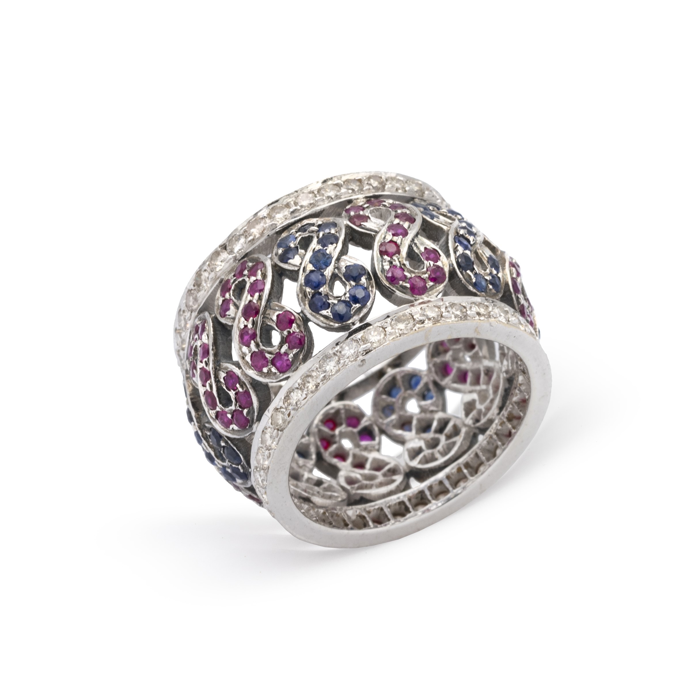 Anello bombé in oro bianco 18kt diamanti rubini e zaffiri