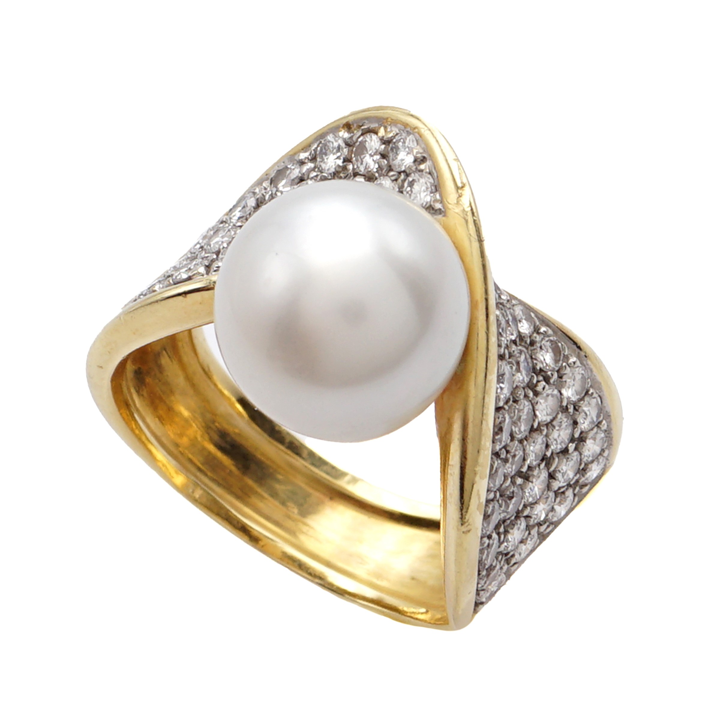 firmato Mikawa perla 11 mm. e diamanti taglio brillante ct 1,20 circa, misura 19