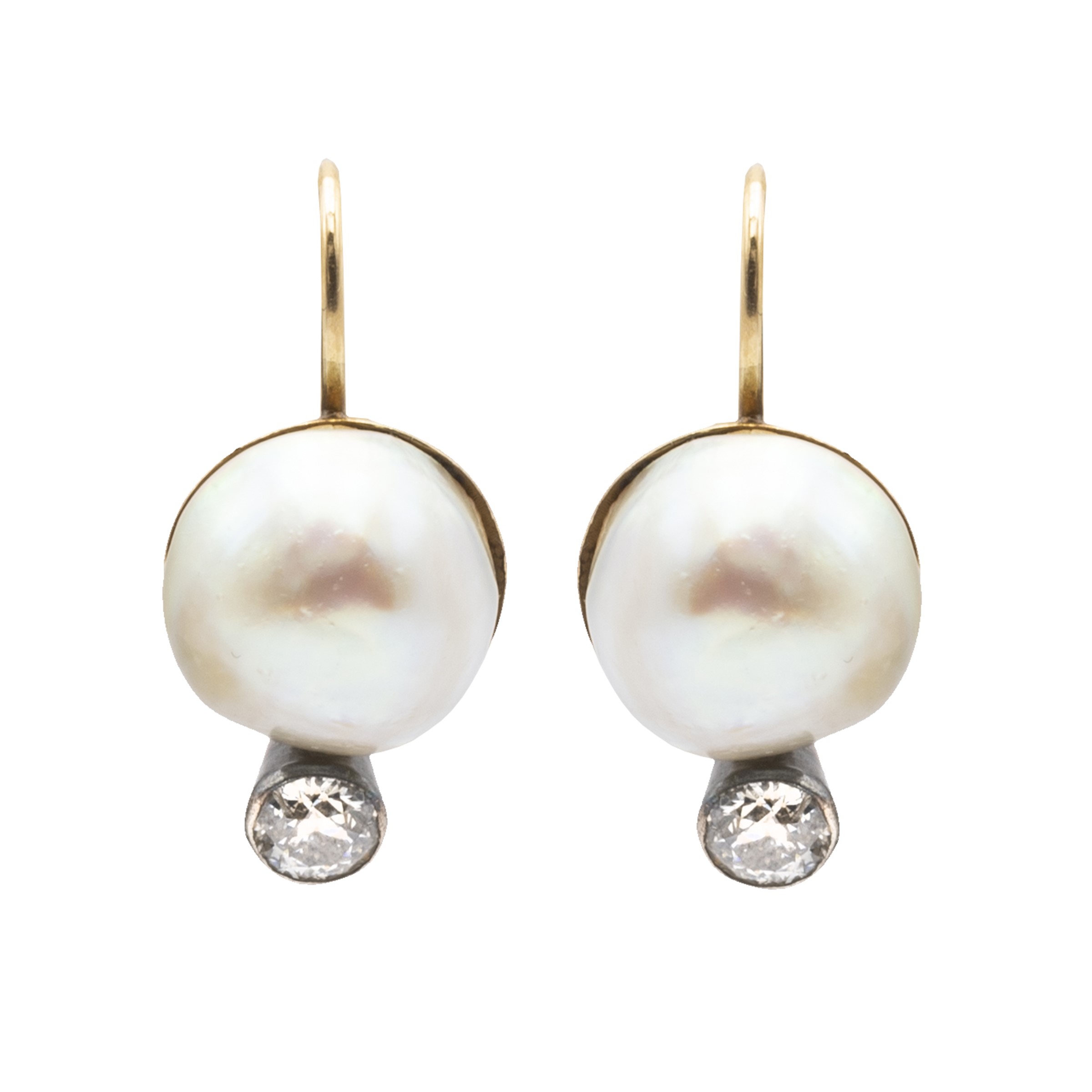 primi '900 mezze perle di 11 mm. circa sormontate da due diamanti taglio brillante antico ct 0,40 circa, lunghezza 2,5 cm.