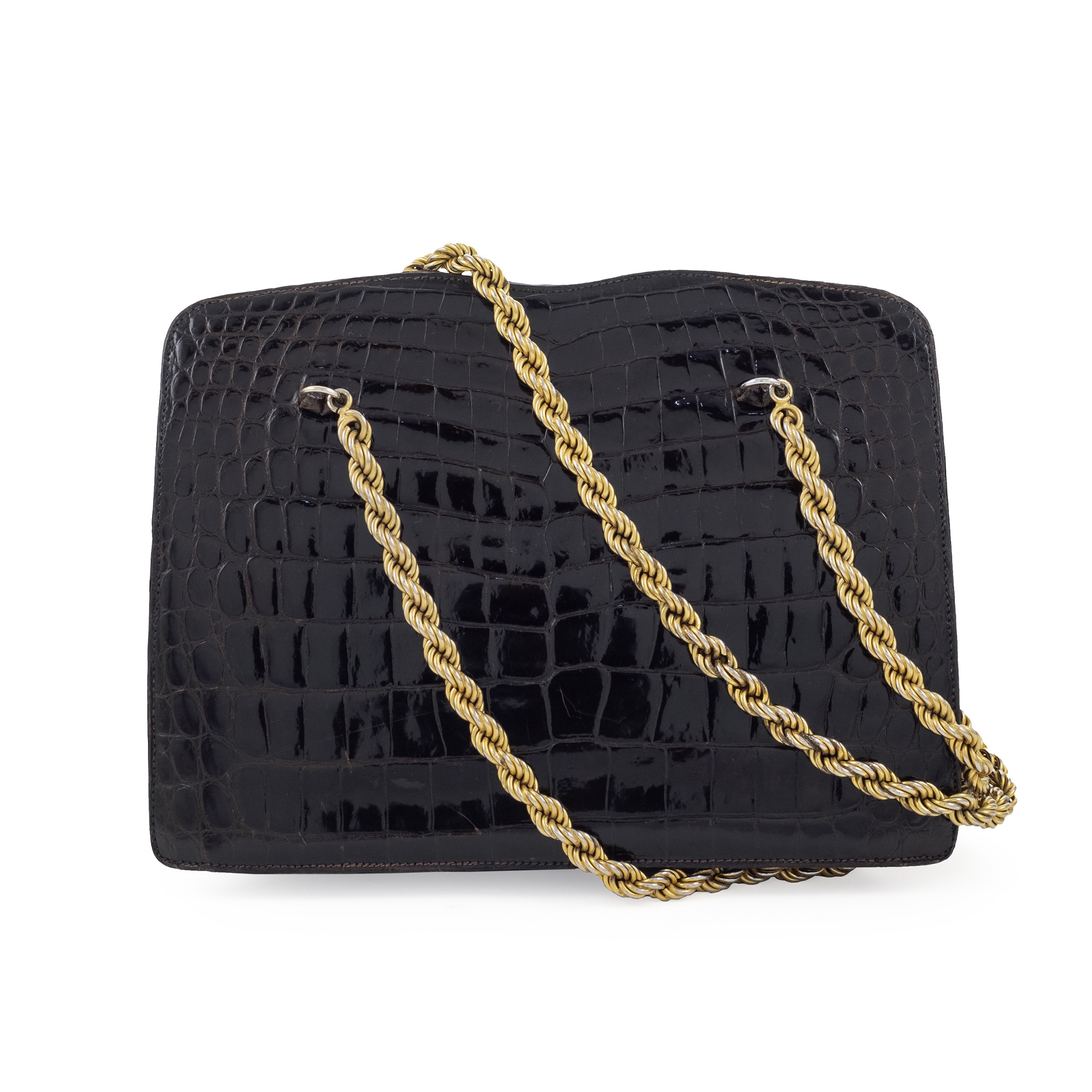 misure 25,5x29x6 cm. anni 60 in coccodrillo marrone, finiture dorate, tracolla a catena a due manici, interno in pelle scamosciata ad uno scomparto con tre tasche di cui una a zip, due tasche esterne, chiusura a scatto, segni di usura, pre-convezione Cites