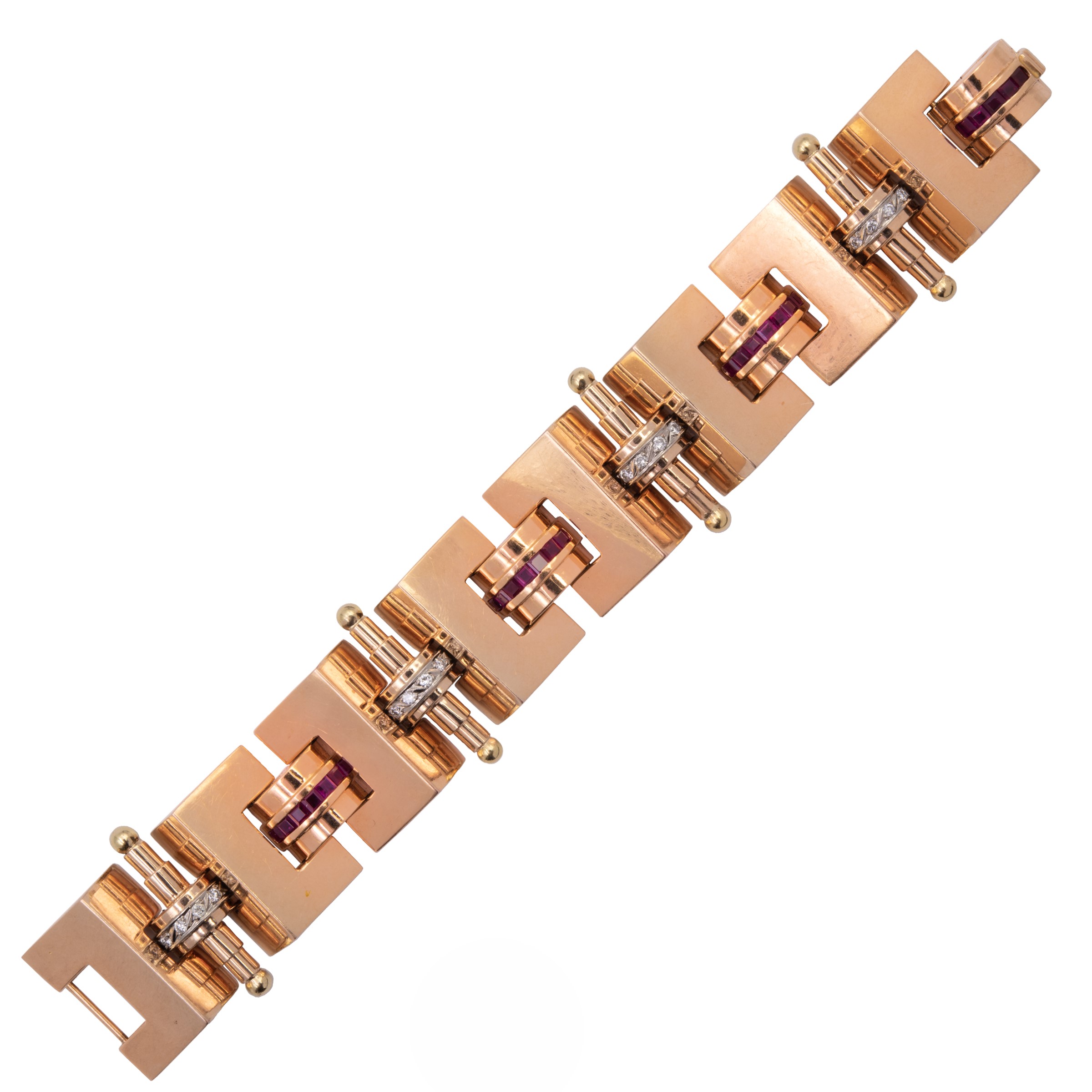impreziosito da diamanti taglio brillante antico e rubini carré, chiusura a scomparsa, lunghezza 20 cm.