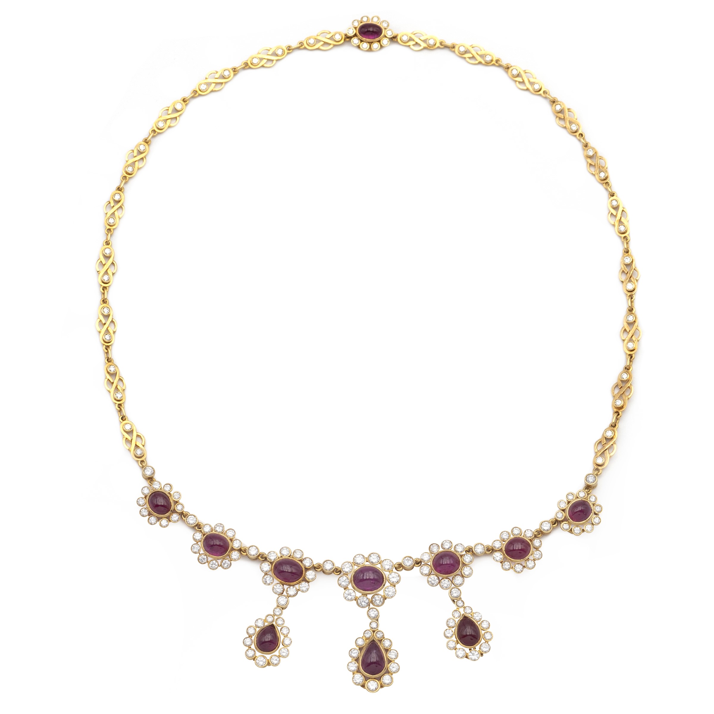 rubini taglio cabochon ovale e a goccia ct 5 circa, diamanti taglio brillante ct 8 circa, chiusura a scomparsa, lunghezza 45 cm.
