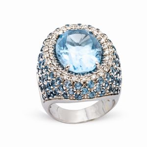 peso 19 gr. taglio ovale briolet contornato da diamanti taglio brillante ct 0,40 circa e topazi azzurri tondi, [..]
