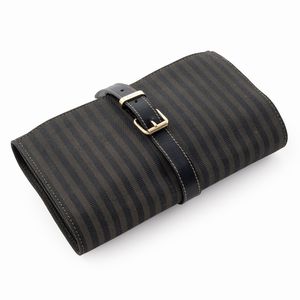 misure 20x12x5 cm. in tessuto rigato, all' interno tre tasche con zip removibili, chiusura a cintura in pelle [..]