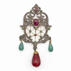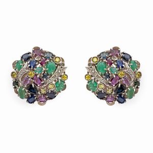 peso 20 gr. tempestati da rubini, smeraldi, zaffiri blu, zaffiri gialli e rose di diamante, diametro 3 cm.