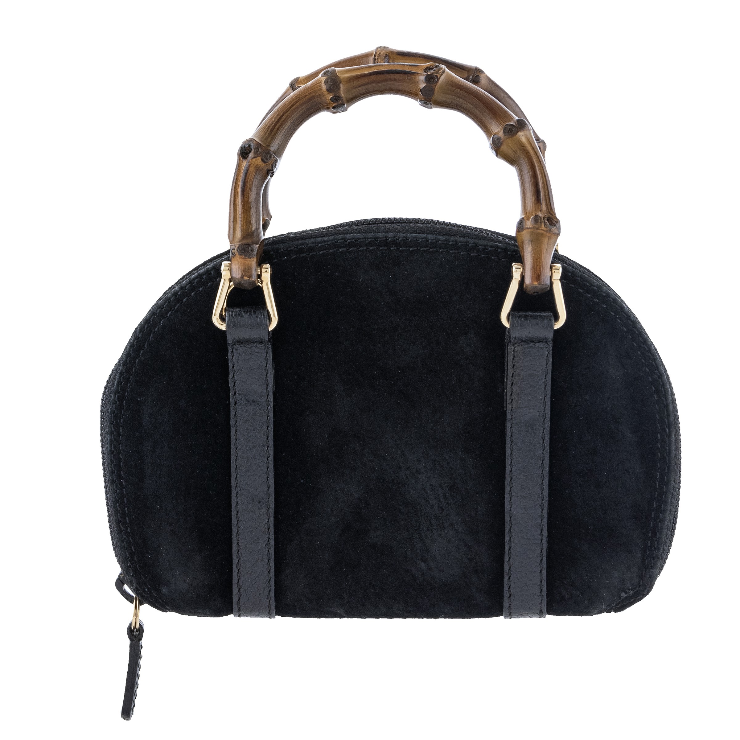 in pelle nera e scamosciata a due manici in bambù, interno a due scomparti con tasca e tre fessure portacarte, condizioni buone