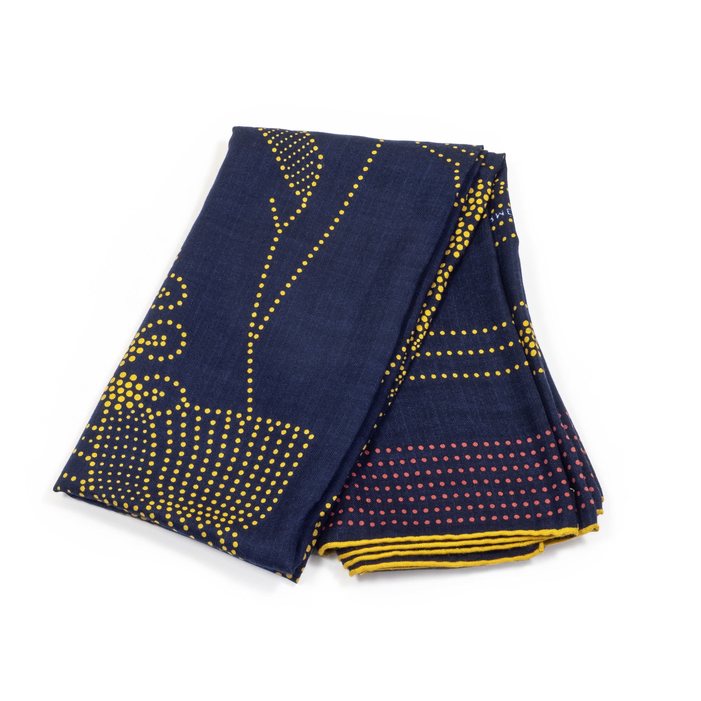 in cachemire e seta, nei toni del blu, giallo e rosso, completo di scatola, ottime condizioni