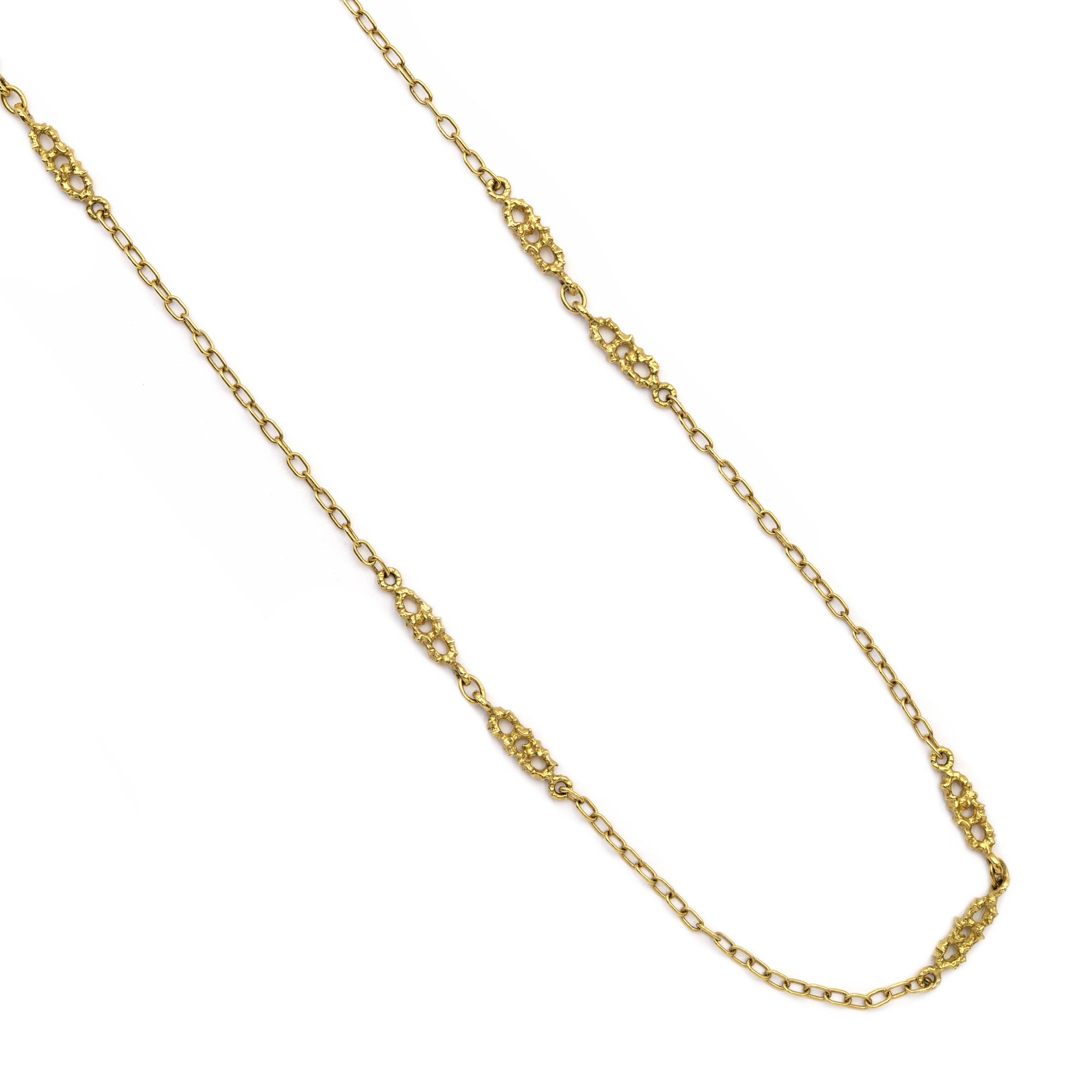 anni 70/80 maglie ovali alternate da elementi traforati in oro martellato, lunghezza 88 cm.