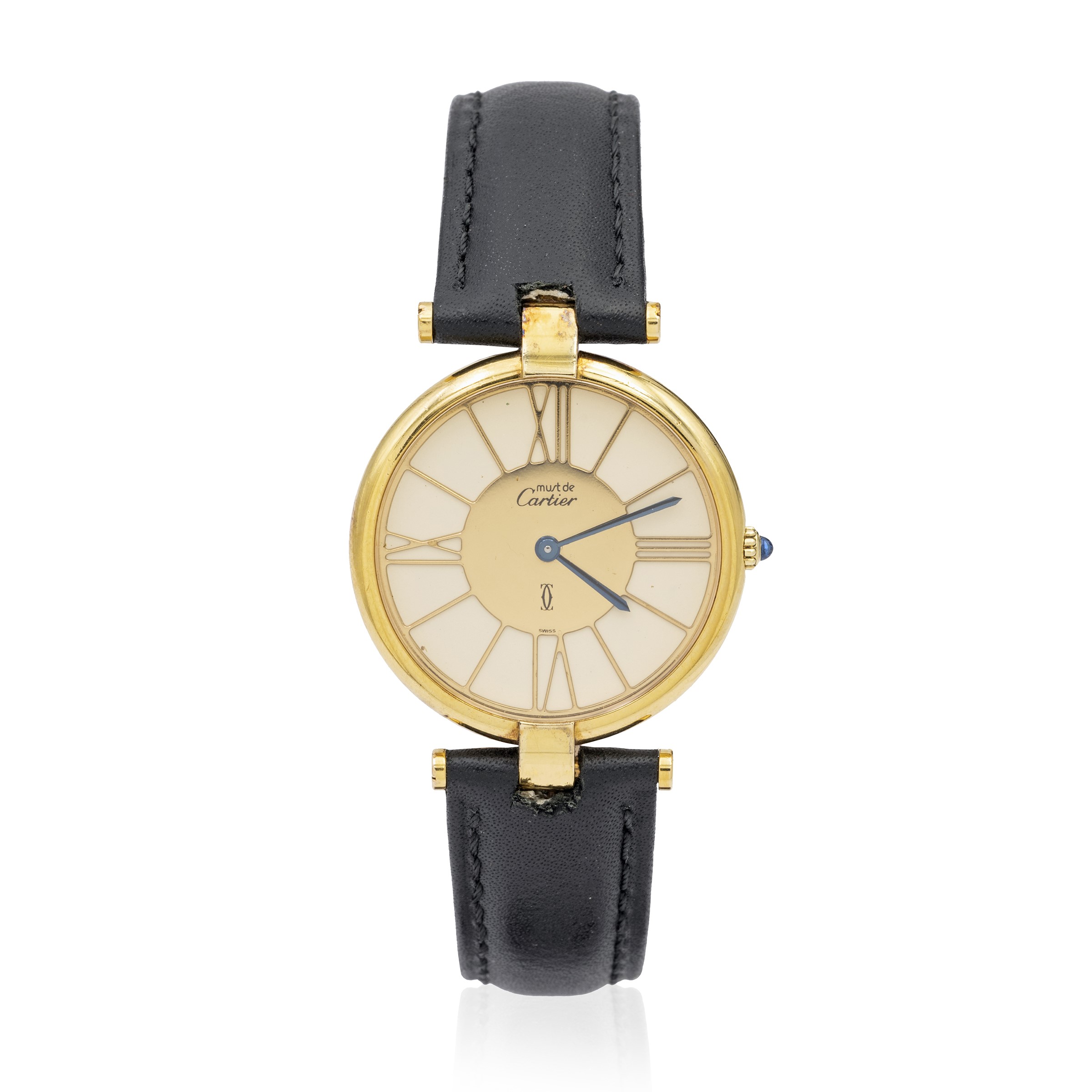 anni 90 circa in argento 925 placcato oro, ref. 17- 091972, cassa tonda 30 mm. quadrante duodial con numeri romani, corona con zaffiro, vetro zaffiro, movimento al quarzo, calibro cartier 81, cinturino in pelle con fibbia in metallo, cassa quadrante e movimento firmati, completo di custodia in tessuto
