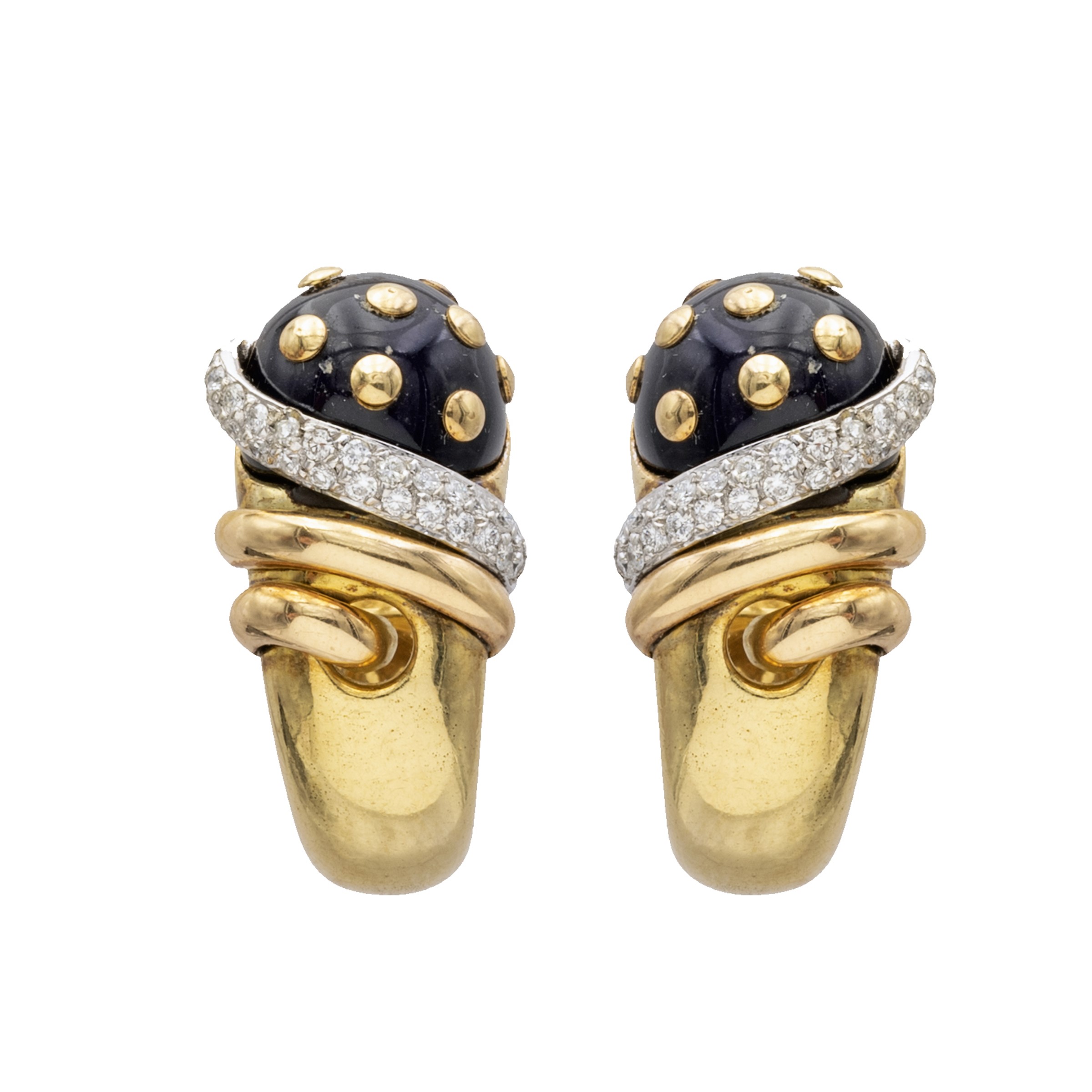 firmati smalto nero e diamanti taglio brillante ct 0,60 circa, lunghezza 2,5 cm. completo di custodia in tessuto