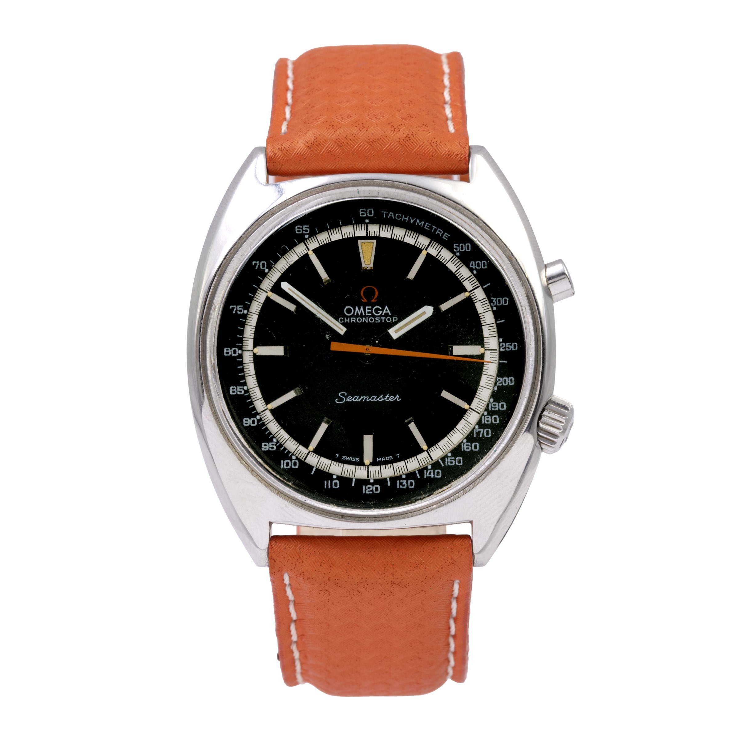 anni 60 cronometro in acciaio, ref. 145.007, cassa 41x47 mm. quadrante nero con indici e scala tachimetrica, movimento meccanico a carica manuale, calibro 865, cinturino in pelle con fibbia in metallo, cassa quadrante e movimento firmati