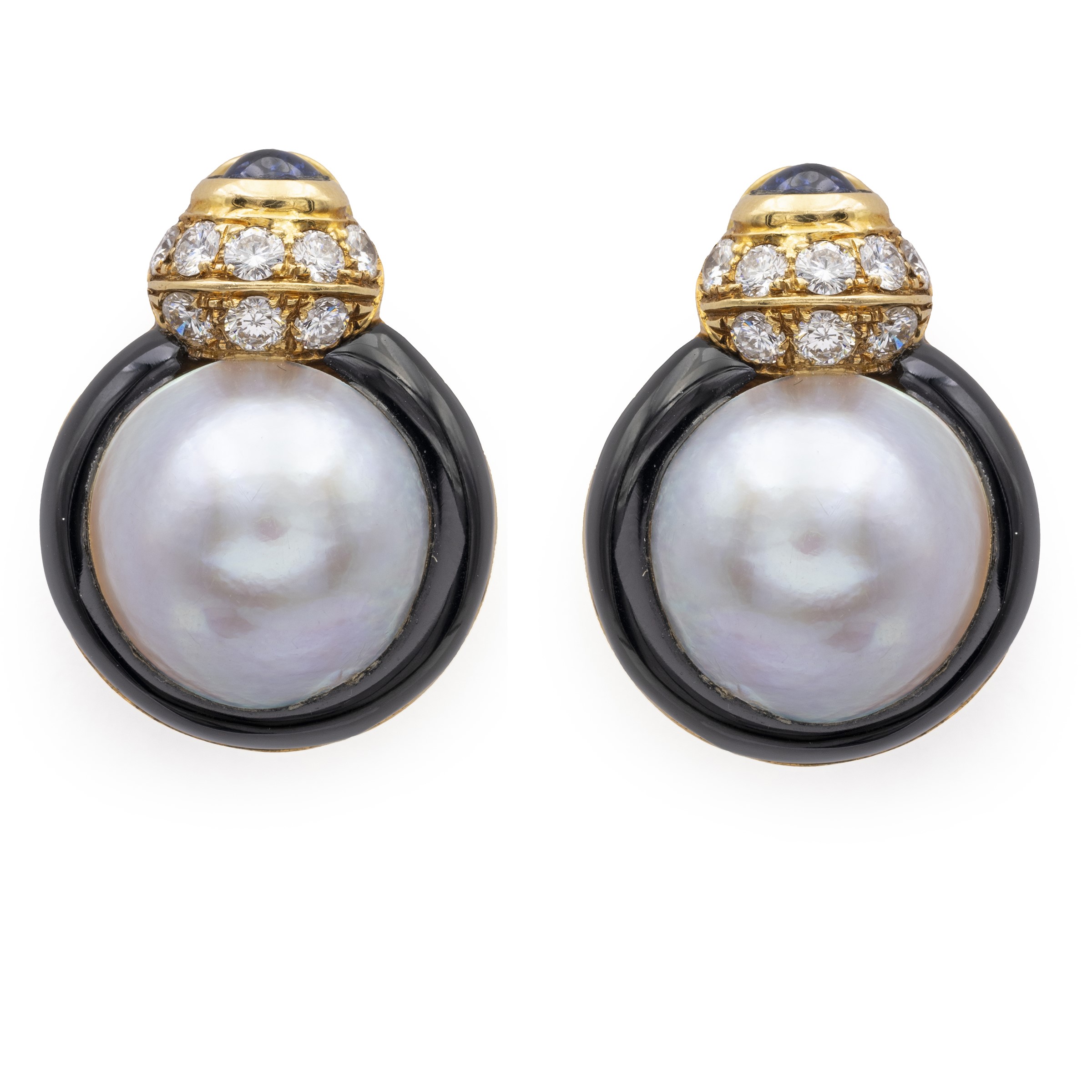 Orecchini a lobo in oro giallo 18kt perle mabé onice nero e diamanti