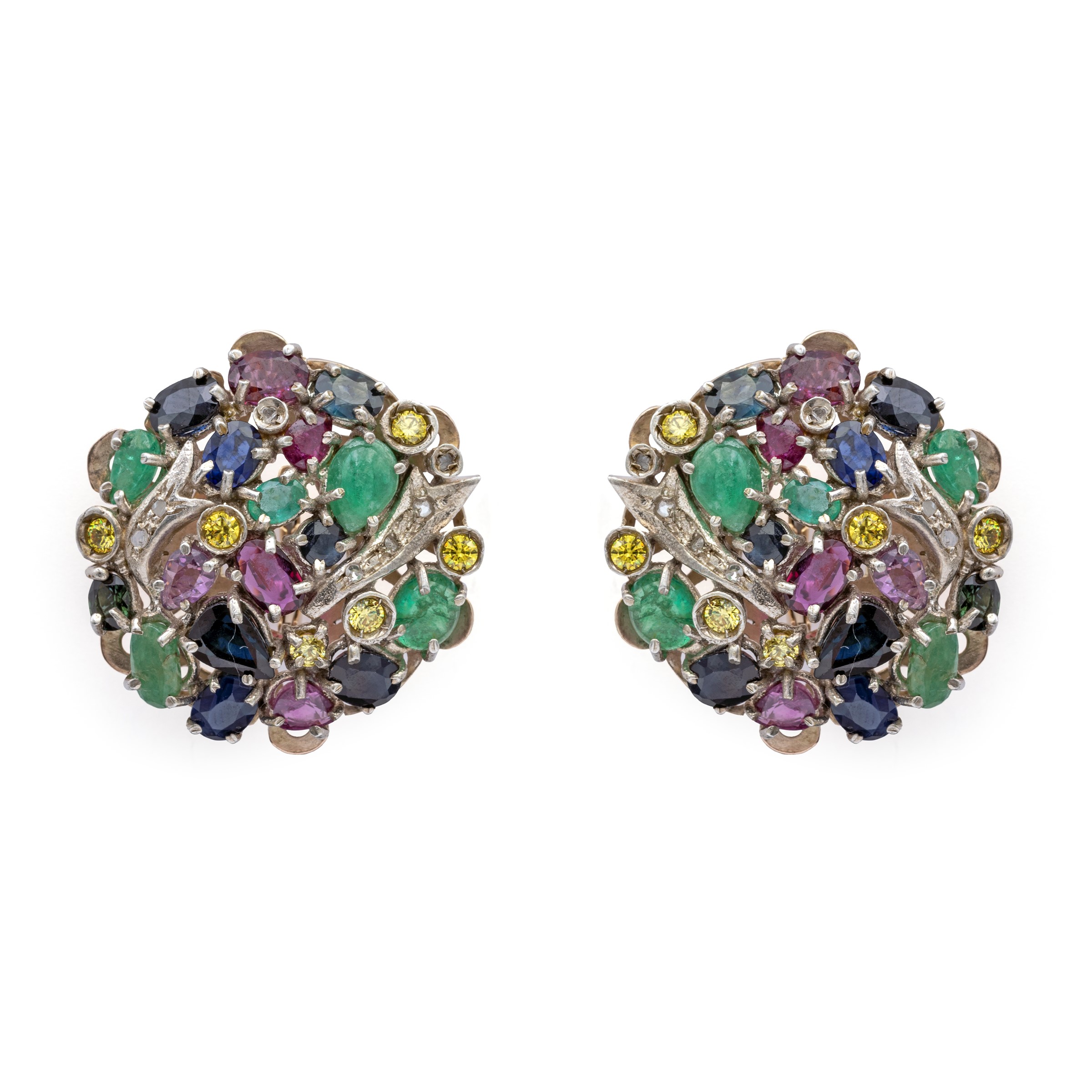 tempestati da rubini, smeraldi, zaffiri blu, zaffiri gialli e rose di diamante, diametro 3 cm.