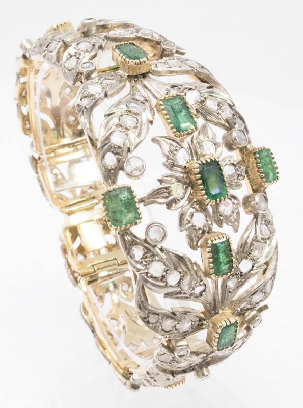 Bracciale a fascia semirigida in oro e argento con rose di diamante e smeraldi