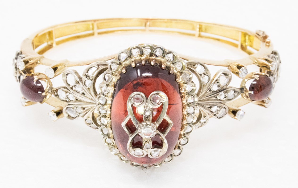 Bracciale rigido in oro giallo, argento, ambra, rose di diamante e piccoli brill [..]