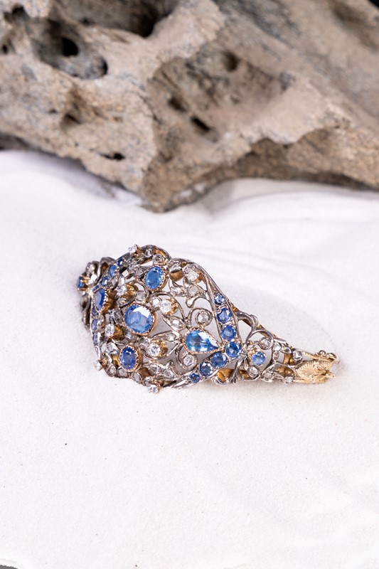 Bracciale rigido in oro giallo e argento con rose di diamante, zaffiri e diamanti [..]