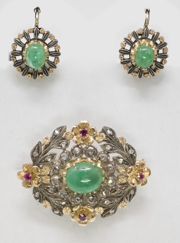 Spilla e orecchini in oro giallo e argento con smeraldi, rose di diamante e rubi [..]