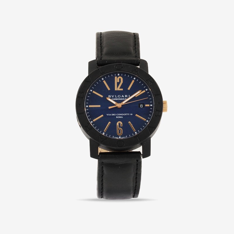 Ref: BB 40 CL, Carbon Gold Roma- Via dei Condotti 10 Cassa: in carbonio e oro, fondello trasparente serrato da viti, movimento a vista. Vetro zaffiro Quadrante: Nero, indici a bastone e numeri Arabi, datario. Sfere a bastone luminose Movimento: automatico Anno: 2014 circa DIM: 40 mm Accessori: scatola originale Nota: cassa scheggiata