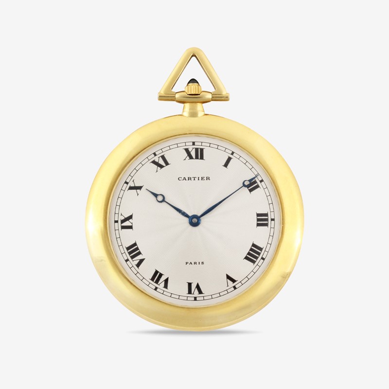 Ref: “Couteau”, da tasca Cassa: in oro giallo 18K, ultra-piatta, firmata e numerata Quadrante: Argento guilloché, numeri Romani. Sfere Breguet Movimento: manuale, firmato Cartier Anno: 1980 circa DIAM: 48 mm