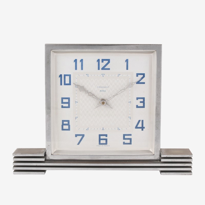 Ref: pendoletta da scrivania Art Deco riserva 8 giorni Cassa: in metallo Quadrante: Argento, numeri Arabi blu. Sfere cattedrale Movimento: manuale Anno: 1920 circa DIM: 13 x 14 x 3 cm