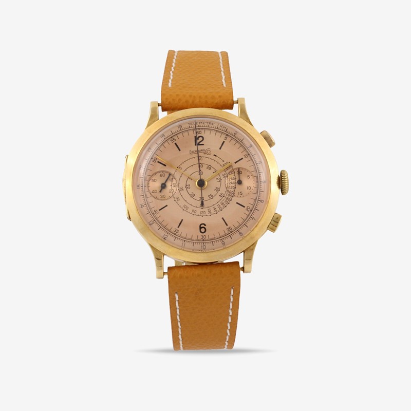 Ref: Pre-Extra Fort, cronografo Cassa: No. 1012462, in oro giallo 18K, fondello a pressione Quadrante: Salmone, numeri Arabi, indici a bastone, contatori ausiliari per i secondi e 30 minuti, scala tachimetrica e telemetrica. Sfere a bastone Movimento: manuale, cal. 16000 Anno: 1940 DIAM: 39 mm