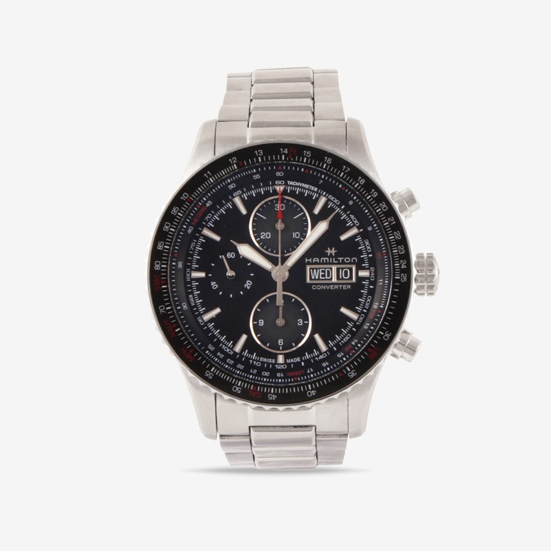 Ref: Converter, cronografo Cassa: in acciaio, fondello a vite con movimento a vista. Vetro zaffiro Quadrante: Nero, indici a bastone, contatori ausiliari per i secondi, 12 ore e 30 minuti, giorno/data. Sfere a bastone Movimento: automatico Bracciale: originale in acciaio con chiusura deployante Anno: 2021 DIAM: 45 mm Accessori: scatola originale, Garanzia Nota: in buone condizioni, Come Nuovo