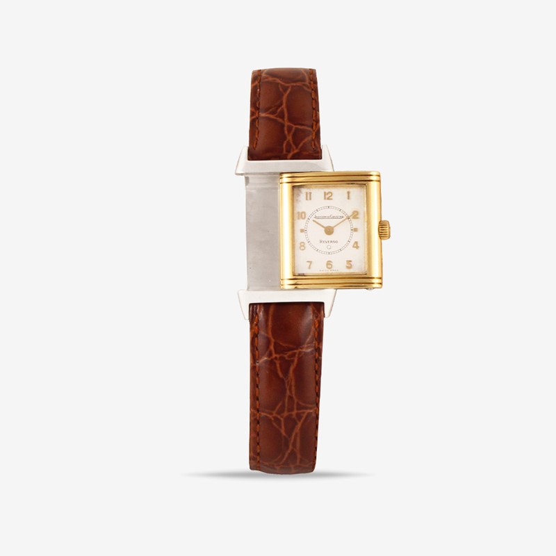 Ref: 140.025.5 Reverso Lady Cassa: in acciaio e oro, reversibile Quadrante: Argento, numeri Arabi. Sfere a bastone Movimento: quarzo Anno: 1990 circa DIM: 33 x 19 mm Accessori: due cinturini aggiuntivi originali, Garanzia originale