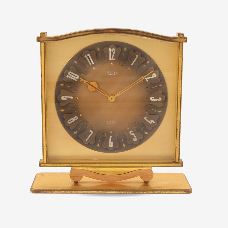 Ref: pendoletta da scrivania riserva 8 giorni con sveglia Cassa: in ottone dorato Quadrante: marrone, numeri Arabi. Sfere dorate Movimento: manuale Anno: 1950 circa DIM: 13 x 15 x 5.5 cm