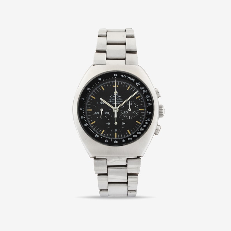 Ref: 145014, Speedmaster Professional, Mark II, cronografo Cassa: in acciaio, fondello a vite, lunetta tachimetrica nera, vetro zaffiro, vetro zaffiro Quadrante: Antracite, indici a bastone, contatori ausiliari per i secondi, 12 ore e 30 minuti. Sfere a bastone luminose Movimento: manuale, cal. 861 Bracciale: originale in acciaio con chiusura deployante originale Anno: 1970 circa DIM: 45 x 41 mm