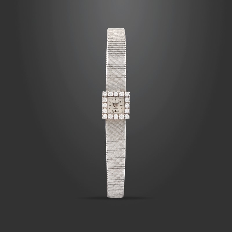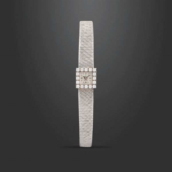 Cassa: in oro bianco 18K, con lunetta in brillanti, fondello a pressione Quadrante: Argento, indici a bastone. Sfere a bastone Movimento: manuale Bracciale: originale integrato, in oro bianco 18K Anno: 1960 circa DIM: 11 x 11 mm GR: 31.6