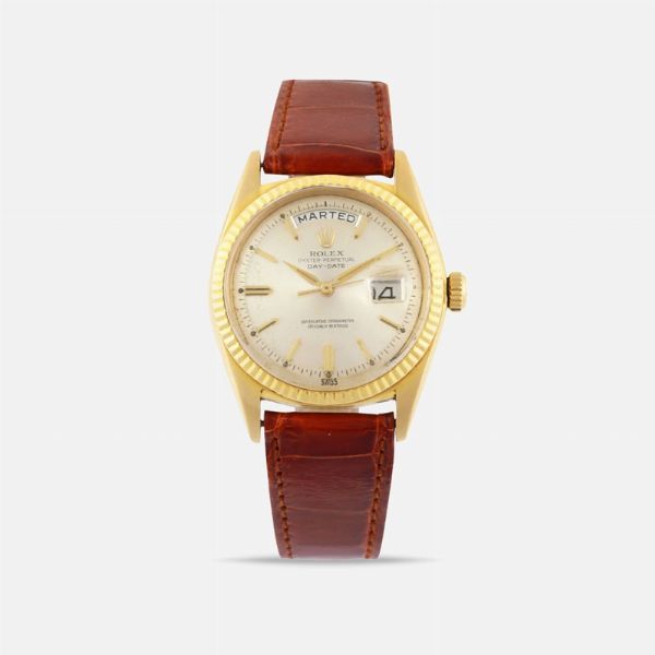 Ref: 1803, Day-Date Cassa: No. 816402, in oro giallo 18K, fondello a vite Quadrante: Argento, indici a bastone sfaccettati, apertura giorno/data. Sfere Alpha luminose Movimento: automatico, cal. 1555, rodiato, scappamento ad ancora, spirale Breguet Anno: 1961 DIAM: 36 mm NOTA: I primi Day-Date degli anni 60 montavano sfere “alfa” più insolite, che apparivano in alcuni modelli e cronografi Bubbleback degli anni '40 e '50, come la referenza 6234. I Rolex Day-Date sono dotati di calendari in varie lingue e questo lotto viene fornito con una versione in italiano.