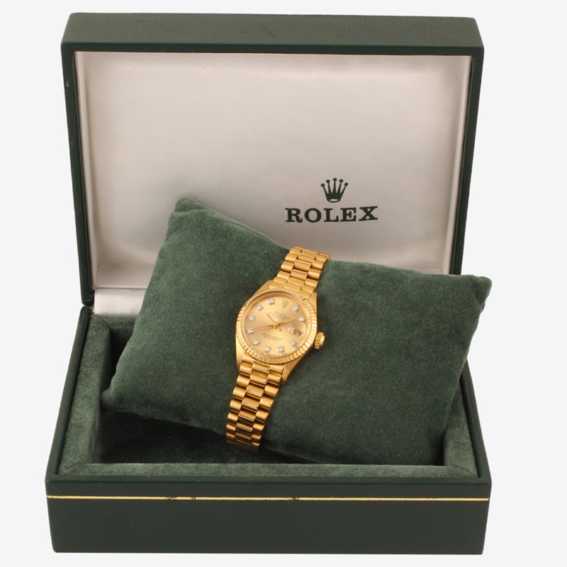 Ref: 6917, Lady Datejust Cassa: oro giallo 18K, fondello a vite Quadrante: Champagne, indici in brillanti, datario. Sfere a bastone Movimento: automatico, cal. 2030 Bracciale: in oro originale President con chiusura deployante Anno: circa 1973 DIAM: 26 mm Accessori: scatola originale Nota: orologio in ottime condizioni, revisionato nel 2019 (copia del documento)