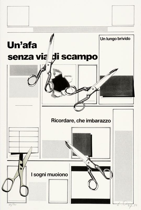 Cartella composta di 5 litografie. mm 470x315. Firmate e datate a matita in basso a destra e numerate in basso a sinistra. Le incisioni sono: 1) La sua voce, la malinconia/profumo del tempo/frammenti di lirismo/Profumo di doni perduti 2) Fantasia e pigrizie/L'incertezza prende tempo/La dolcezza in una voce/Fra pudore e carezze/E il futuro è scandalo 3) Tenero è il risveglio/Cercando un altro futuro/un'idea, un sogno/tra paure e speranze/per dire: vogliamo vivere/E l'uomo alzò la testa 4) Aspettando il passato/non pone ostacoli/Il libro magico della memoria/tra realtà e desiderio 5) Un'afa/senza via di scampo/Ricordare, che imbarazzo/I sogni muoiono. Es, 37/50. SI AGGIUNGONO: 2) Id., Ricordo di una terra. 1981. Litografia. mm 270X270. Foglio: mm 300x300. Firma e data a matita in basso a destra, tiratura in basso a sinistra. Es. 72/100. 3) Id., C'è ancora tempo. 1988. Litografia. mm 255x350. Firma e data a matita in basso a destra. Il foglio è ripiegato e al piatto posteriore è presente un testo di Gillo Dorfles sull'artista.