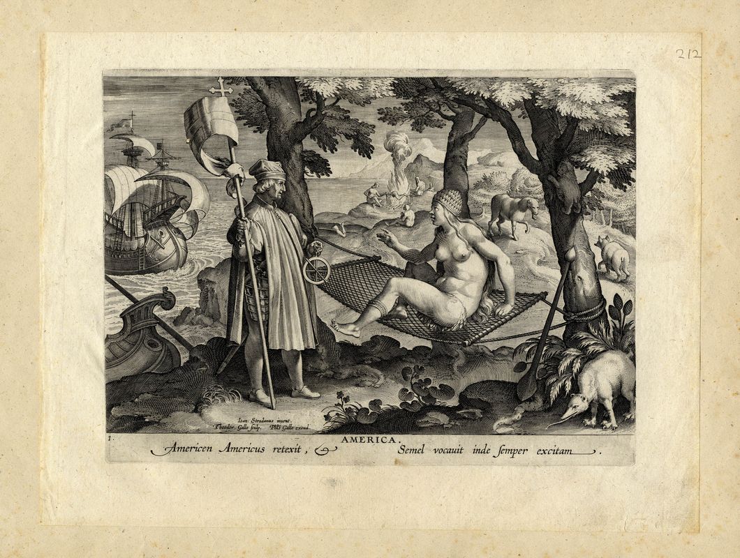 Bulino. mm 202x268. Foglio: mm 256x335. Baroni Vannucci, 697/1. New Hollstein, 323. Nell'immagine in basso a sinistra "Ioan.Stradanus Invent.", "Theodor Galle Sculp." e "Phls. Galle excud.", nel margine sottostante il numero "1" all'angolo sinistro, il titolo e una riga in latino. Prima tavola da Nova Reperta serie di venti incisioni, commissionata a Giovanni Stradano da Luigi Alamanni, nobile ed erudito fiorentino, tra il 1587 e il 1589. Le tavole, pubblicate da Philip Galle e incise dallo stesso Galle, dal figlio Theodor e da Jan Collaert su disegno dello Stradano, presentano le "nuove scoperte" dell'epoca moderna con un'attenzione particolare alla scoperta dell'America. Bellissima prova, nel I stato su 4 prima dell'indirizzo di C. de Mallerij, stampata con tonalità e brillante inchiostrazione, su sottile carta vergellata.