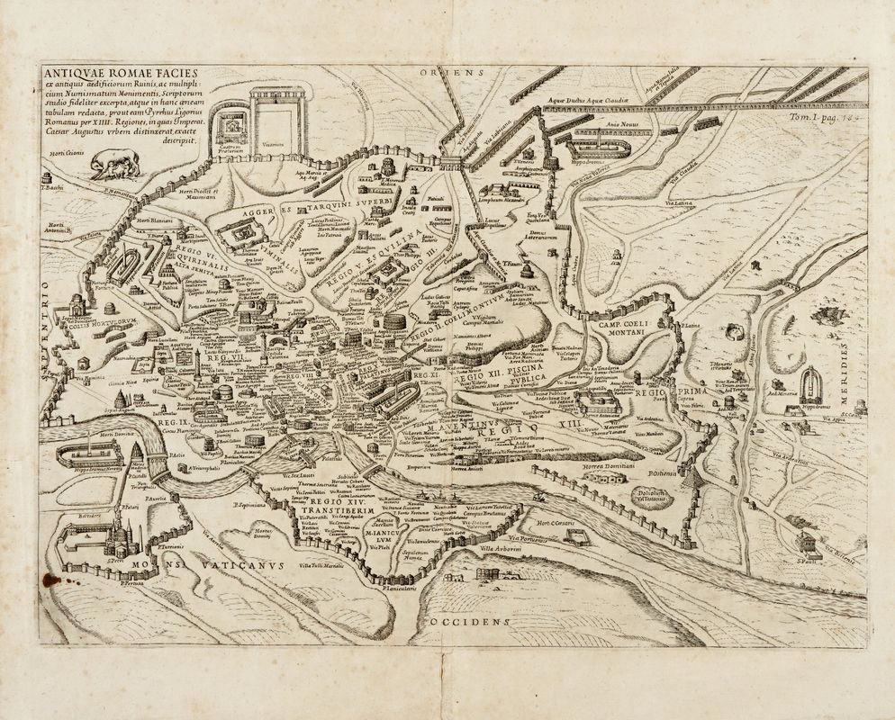 Bulino. mm 310x437. Foglio: mm 407x485. Veduta di Roma antica tratta dall'originale di Giulio De Musi pubblicato da Michele Tramezzzino nel 1553. Tavola dal volume di Paolo Aringhi, Roma subterranea nouissima : in qua post Antonium Bosium...Roma, Vitale Mascardi MDCL1. Bella carta vergellata sottile con filigrana "ancora e lettera M in cerchio singolo sormontato da stella a sei punte".