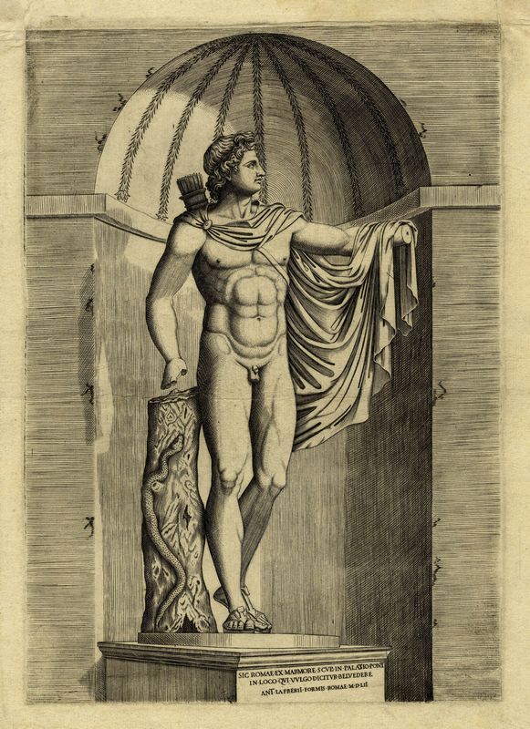 Bulino. mm 330x235. Foglio: mm 365x267. Bartsch, XIV, 330/331 (copia). Huelsen, 57a. Da Speculum Romanae Magnificentiae. Copia nello stesso verso da originale di Marcantonio Raimondi. Bellissima impresione stampata con segno pieno e brillante su carta vergellata sottile con filigrana "scala a cinque pioli in cerchio singolo sormontato da stella a sei punte" (Woodward, 239. Roma e Venezia 1548-1560). Al verso in basso marchio di collezione a inchiostro nero con la "lupa capitolina e iniziali A O entro rettangolo" (non su Lugt).