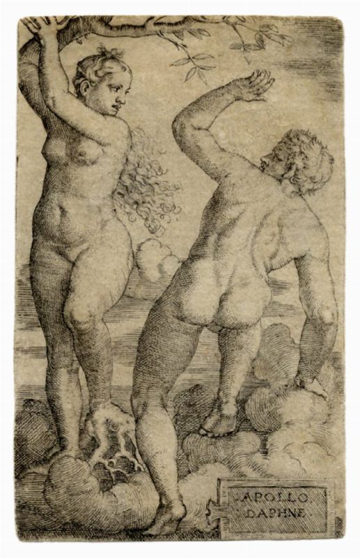 Bulino. mm 81x50. Bartsch, 25. Hollstein, 15. Con il titolo nella tavoletta in basso a destra. Buona prova stampata ancora con segno ben definitivo e leggibile, nel IV e definitivo stato su 4, su carta vergellata con parte di filigrana non identificabile. Al verso marchio della collezione del barone Adalbert Freiherr von Lanna (Lugt, 2773).
