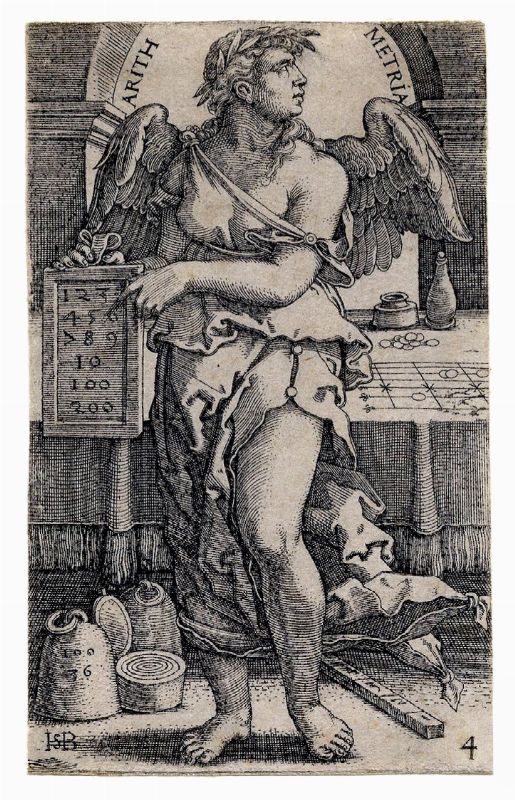Bulino. mm 89x55. Bartsch, 124. Hollstein, 126. Quarta tavola dalla serie Le sette arti liberali (Hollstein, 123-129). Ottima impressione nell'unico stato censito su carta vergellata sottile priva di filigrana.