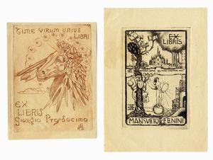 1908-46. 1) Raoul Dal Molin Ferenzona , Ex libris Giorgio Prosdocimo . Incisione. mm 87. Foglio: mm 132x100. [..]