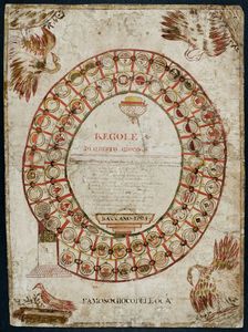 Bazzano 1795. Acquerello a colori su carta vergellata pesante. mm 624x470. Gioco su due cerchi concentrici con [..]