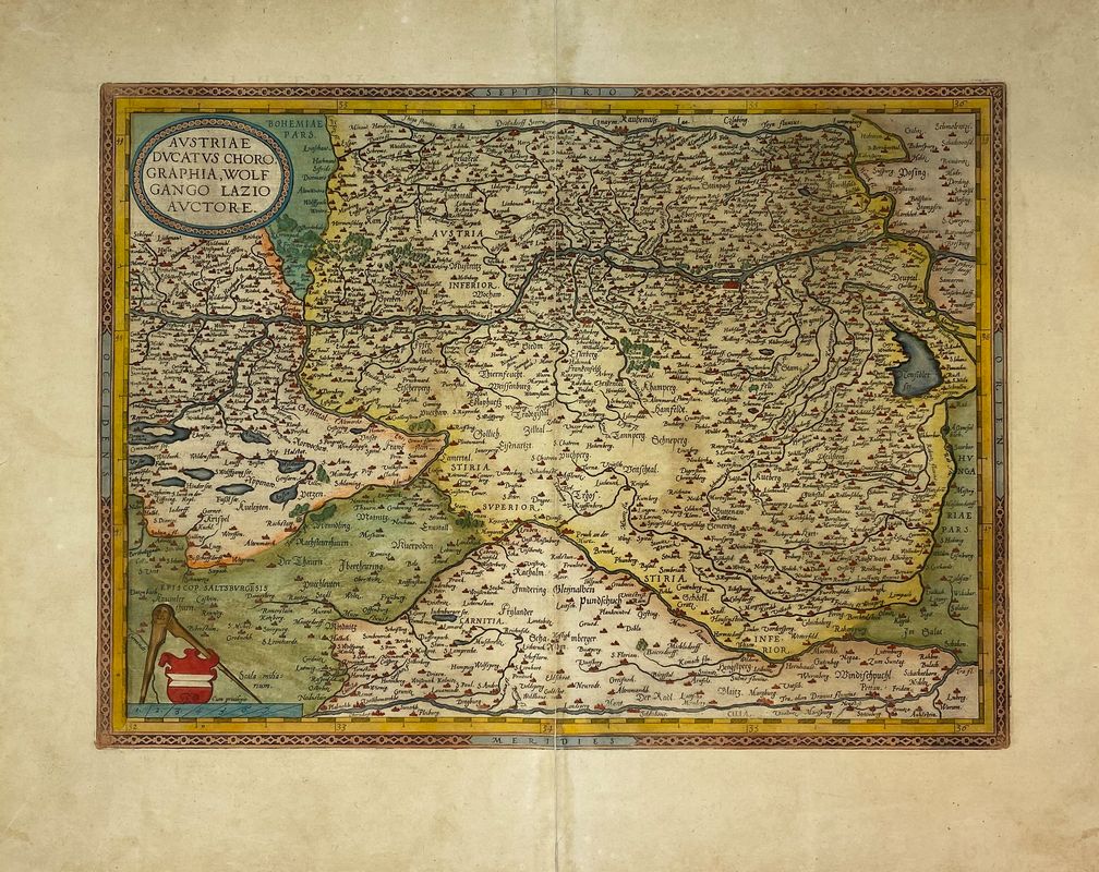 Incisione in rame, in coloritura. mm 338x467. Foglio: mm 466x570. Da Theatrum Orbis Terrarum. Testo latino al verso. Disegnata dal cartografo austriaco Wolfgang Latius (Lazio), la mappa mostra l'area dal Salzkammergut fino al lago di Neusiedl, e si estende a nord fino a Znaim, a sud fino alla Carinzia.