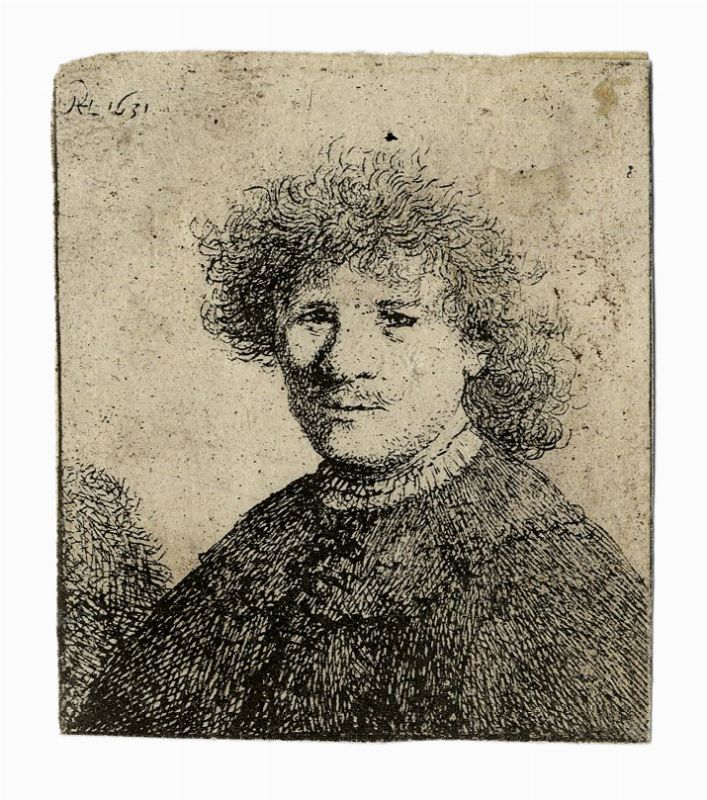 Acquaforte e bulino, con tocchi a puntasecca e bulino. mm 59x51. White & Boon, 15. New Hollstein, 98w. Con il monogramma e la data in alto a sinistra "RHL 1631". Monogramma e data reincisi (non da Rembrandt) nel II stato, con il cambio da "1630" a "1631". Buona prova nel raro II stato su 10 secondo New Hollstein (prima dell'allungamento dei capelli sul lato destro e dell'aggiunta di nuovi segni a puntasecca sulla chioma in alto, prima della ridefinizione della bocca e della narice e di alcuni tratti sulla guancia), con alcuni segni afflievoliti ma prima di ogni rilavorazione della lastra, su carta vergellata lievemente spessa.