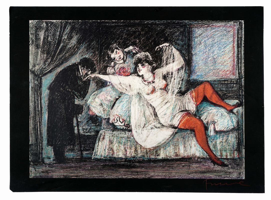 Pastello grasso e carboncino su carta. mm 425x590. Firmato sul supporto di cartone nero a pastello rosso in basso a destra.
