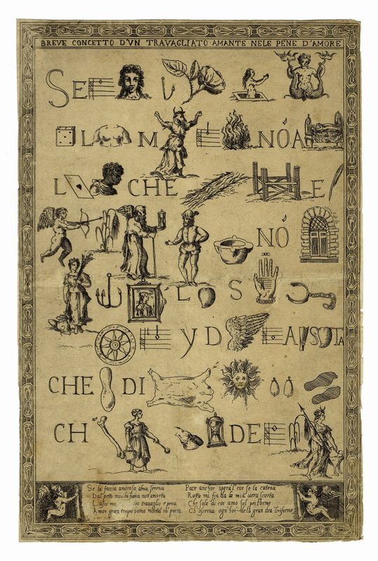 Acquaforte. mm 340x227. Con il titolo che corre lungo il lato in alto e al margine in basso la soluzione del rebus in quattro righe di versi disposti su due colonne, entro cartiglio a nastro srotolato da due amorini. Rebus facente parte di una coppia dedicata alle pene d'amore, nel pendant dal titolo Concetto d'un amante uscito dele pene d'amore, al margine inferiore sulla destra è presente il monogramma del Brambilla seguito da "inven". Ottima prova di questo raro foglio impressa su carta vergellata con filigrana "losanga con stella a sei punte all'interno in cerchio singolo" (Woodward,294-296, Roma 1555-1570).
