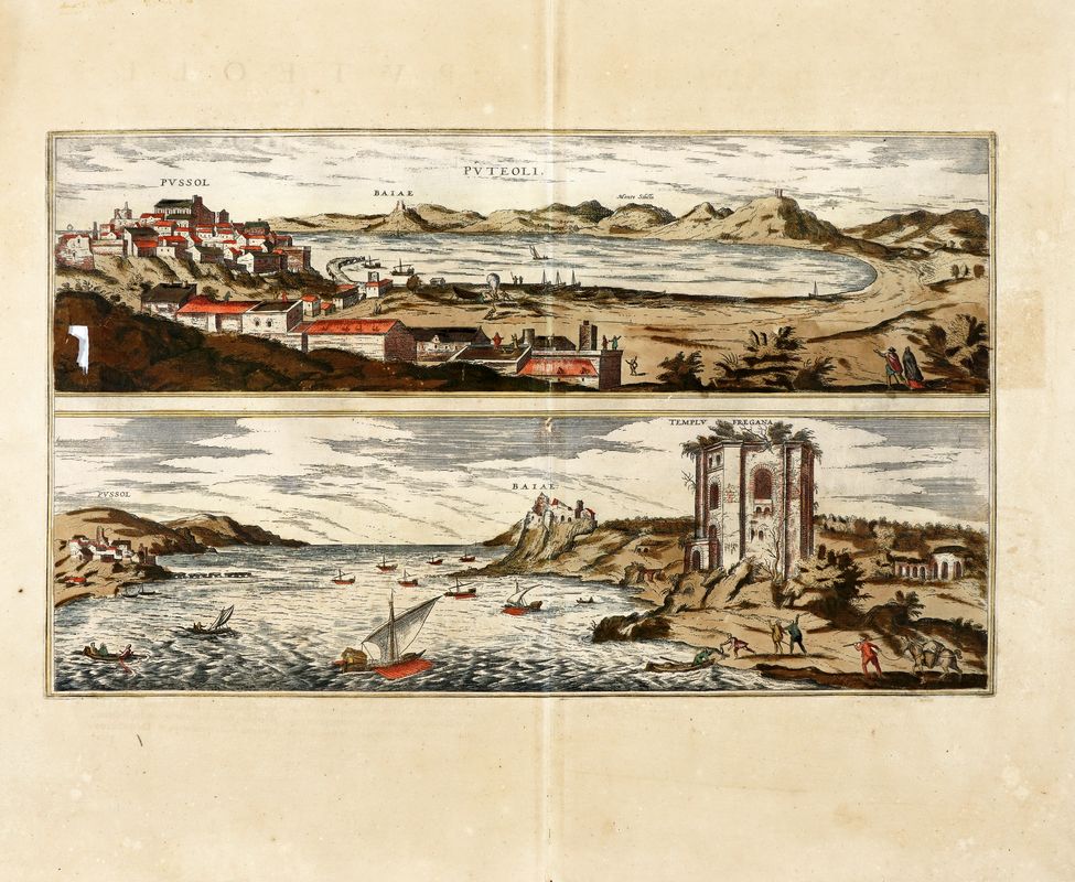 Incisione in rame, in coloritura. mm 368x495. Foglio: mm 485x585. Datata "1597" in lastra a fine dell'iscrizione al margine superiore. Dal V volume di Civitates Orbis Terrarum pubblicato perla prima volta in edizione latina nel 1598. Testo latino al verso. Veduta della città fortificata di Caiazzo a Nord Est di Capua e vicina al fiume Volturno. SI AGGIUNGONO: Id., Tricaricum Basilicatae Civitas. Incisione in rame, in coloritura. mm 323x505. Foglio: mm 495x580. Dal VI volume di Civitates Orbis Terrarum pubblicato per la prima volta in edizione latina nel 1617. Testo latino al verso. Veduta di Tricarico, in provincia di Matera. La città è raffigurata da ovest, con ben visibili le tre cittadelle da cui prende il nome. Gli edifici medievali e la pianta stradale, in combinazione di elementi dell'architettura araba, bizantina e normanna, sono distinti da numeri, con legenda in fondo alla mappa entro cartiglio a cinghie. L'edificio più in vista del paese è la Torre Principale, torre normanna annessa al Monastero di Santa Chiara. La pianta è ulteriormente decorata con tre stemmi nella parte alta. /Id., Puteoli. Incisione in rame, in coloritura. mm 290x490. Foglio: mm 483x580. Dal II volume di Civitates Orbis Terrarum pubblicato per la prima volta in edizione latina nel 1575. Testo latino al verso. Foglio con le due vedute di Pozzuoli e Baia.