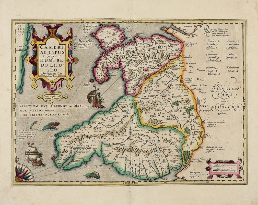 Incisione in rame, in coloritura. mm 350x498. Foglio: mm 460x560. Testo francese al verso. Prima mappa a stampa del Galles incisa da Pieter van den Keere da una carta manoscritta disegnata dal gallese Humphrey Lhuyd (1527-68) poco prima della sua morte e pubblicata per la prima volta cinque anni dopo, nel 1607, dal suo amico Abraham Ortelius. SI AGGIUNGE: Johannes Blaeu. Comitatus Salopiensis; Anglice Shropshire. Amsterdam, 1662 ca. Incisione in rame. mm 385x500. Foglio: mm 505x596. Testo latino al verso. Il titolo è in basso a sinistra all'interno di un cartiglio decorato con i vari prodotti della contea. In alto sono posizionati lo stendardo reale e lo stemma reale, oltre gli stemmi di Roger Montgomery e John Talbot sorretti da un cherubino. In basso a destra la scala milliaria inglese con un cherubino che scruta il cielo e una sfera armillare.