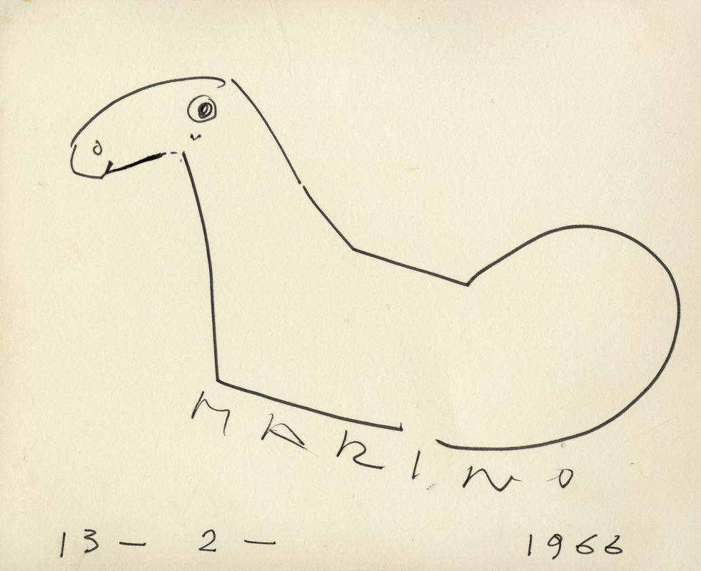 Disegno recto/verso. Pennarello, penna a sfera e matita su carta. mm 245x205. Firmato e datato in basso. Al verso: "Sabato 14 febbraio 1966. Marino da noi! E gli amici del Caffè Sport". Controfirmato e variamente iscritto. Opera accompagnata da certificato di autenticità su fotografia dell'Archivio Marino Marini. L'opera è stata archiviata con il numero 728.