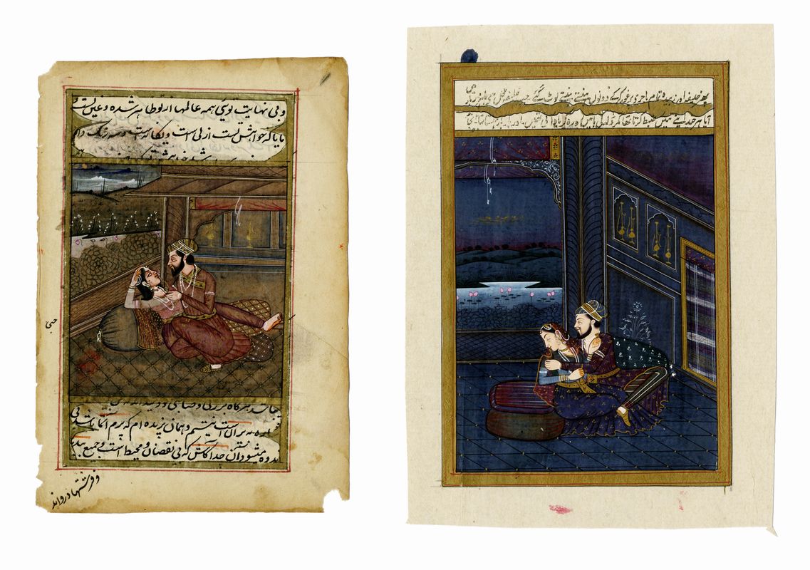 Tempera a colori, pittura oro, su carta a mano spessa con vergelle. Al verso testi islamici. mm 153/174x94/118. Foglio: mm 180/207x123/152. La pittura moghul è uno stile nato in Asia meridionale, generalmente utilizzato in miniature per illustrazioni di libri; ha origine dalla pittura in miniatura persiana, alla quale si sommarono influenze indiane indù, giainiste e buddiste. Fiorì in gran parte durante l'impero moghul (XVI-XIX secolo), e in seguito si diffuse ad altre corti indiane, musulmane, indù e successivamente sikh. I dipinti in miniatura in stile Mughal vengono ancora oggi realizzati da un piccolo numero di artisti nel Rajasthan.